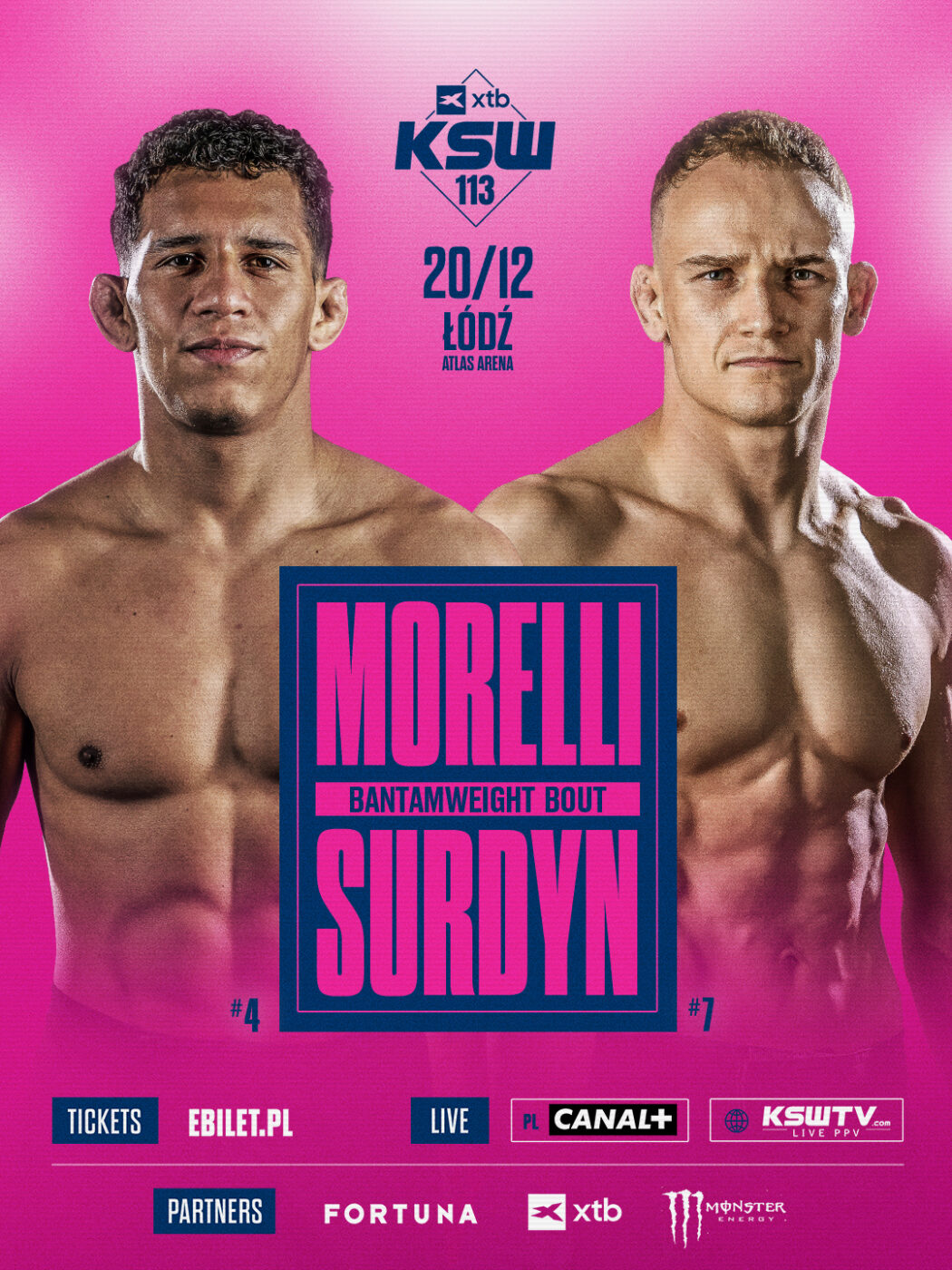 Jak ogłoszono podczas programu Oktagon Live w Kanale Sportowym, w pojedynku kategorii piórkowej gali KSW 113 w Łodzi Marcello Morelli (6-4, 4 KO, 1 Sub), były pretendent do pasa, a dziś numer cztery rankingu, stanie do rywalizacji z Patrykiem Surdynem (8-4, 1 KO, 2 Sub), numerem siedem zestawienia. Do konfrontacji dojdzie 20 grudnia w Atlas Arenie.